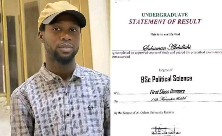 Suleiman Abdullahi has made his institution proud by graduating with a First Class degree in Political Science from Al-Qalam University Katsina.
