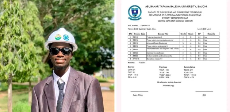 Abubakar Tafawa Balewa University (ATBU) in Bauchi has produced an exceptional engineering talent, Suleiman Sani Sulen-Jebu, who graduated with a remarkable first-class degree in Electrical and Electronic Engineering.