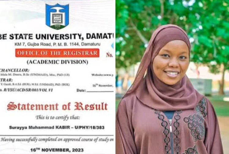 Yobe State University, Damaturu, has congratulated its outstanding student, Surayya Muhammad Kabir, on achieving a remarkable first-class honour in Physics.