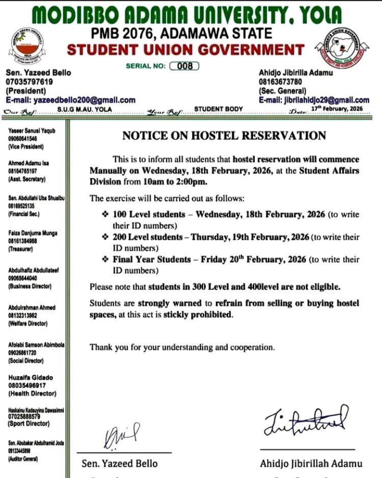 Modibbo Adama University wishes to inform students that hostel reservations will commence manually at the Student Affairs Division from 10:00 a.m. to 2:00 p.m. on Wednesday, 18th February 2026.