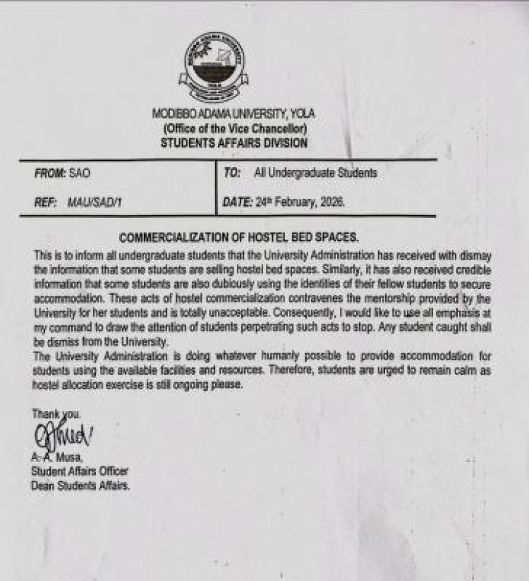 The Management of the Modibbo Adama University has issued a stern warning to all undergraduate students regarding the illegal sale and misuse of hostel bed spaces.