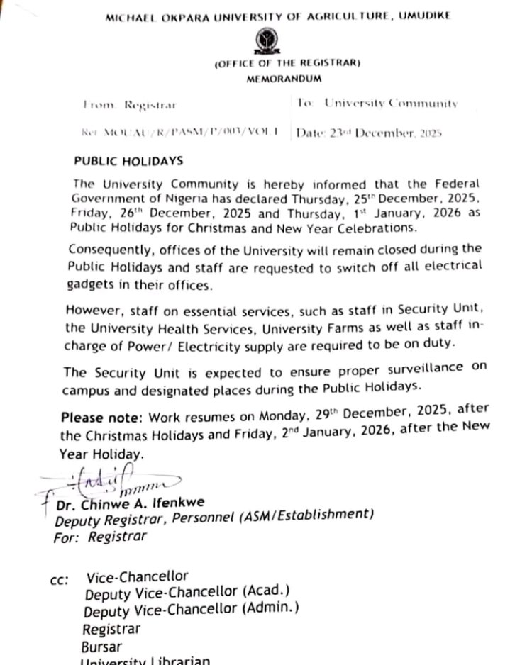 The Michael Okpara University of Agriculture, Umudike (MOUAU) community is hereby informed that the Federal Government of Nigeria has declared Thursday, 25th December 2025; Friday, 26th December 2025; and Thursday, 1st January 2026 as public holidays for the Christmas and New Year celebrations.