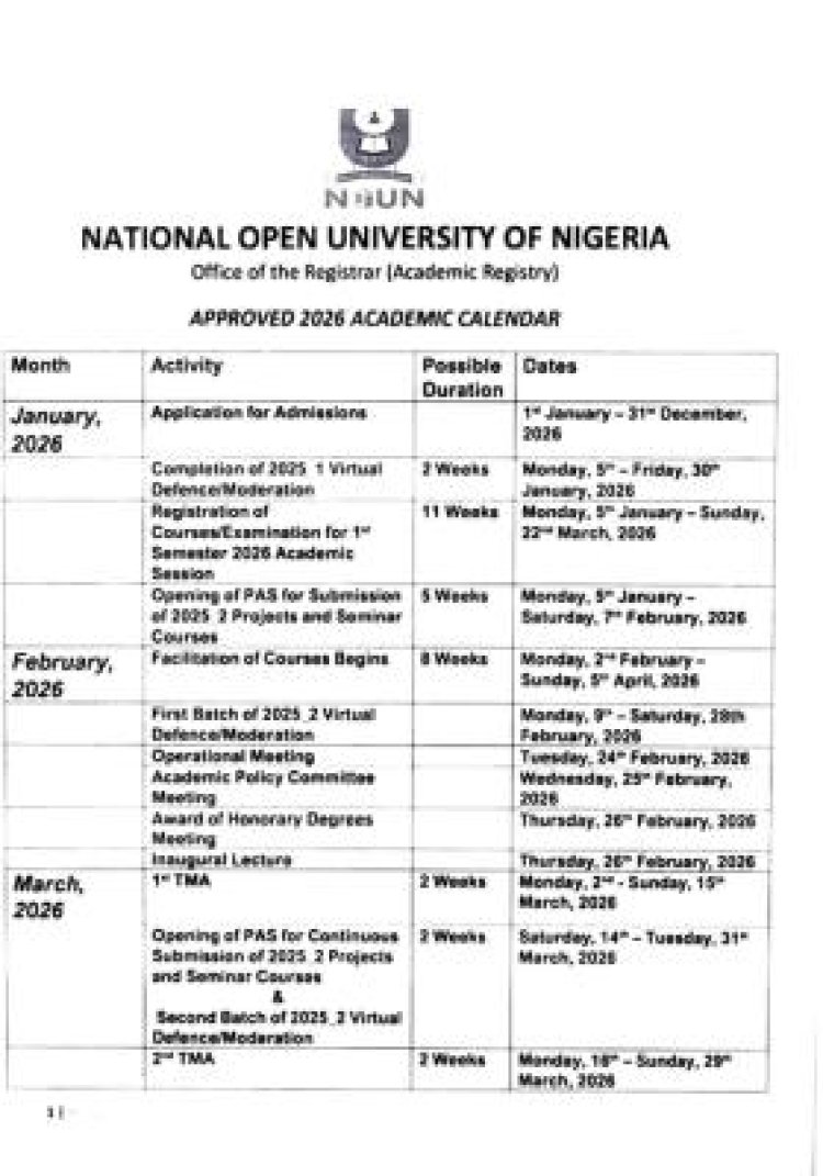 The Office of the Registrar (Academic Registry) of the National Open University of Nigeria (NOUN) has officially published the academic calendar for the first quarter of 2026, providing students and prospective applicants with key dates and deadlines to guide their academic planning.