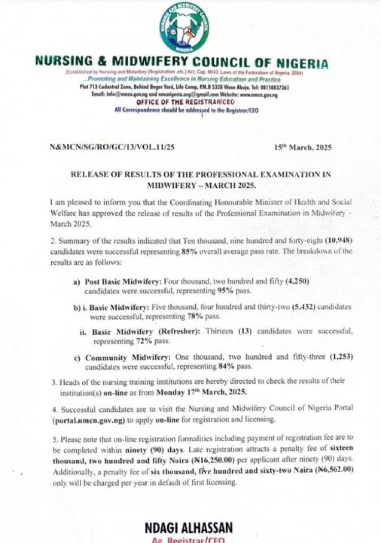 The Nursing and Midwifery Council of Nigeria (NMCN) has released the results of the March 2025 Professional Examination in Midwifery, with 10,948 candidates passing, representing an 85% overall success rate.