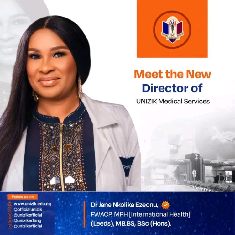 The Management of the Nnamdi Azikiwe University (UNIZIK) has appointed Dr Jane Nkolika Ezeonu, a Consultant Community Medicine Physician and specialist in Health Policy and Management, into a leadership role at its Medical Centre, bringing on board decades of clinical, administrative, and public health experience.
