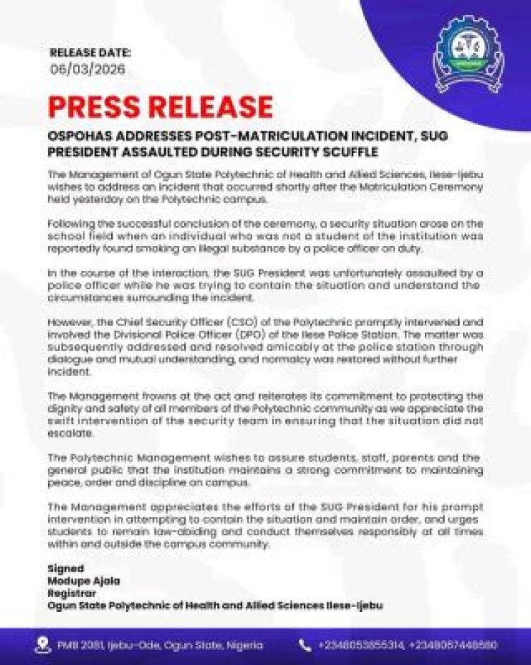 The Management of Ogun State Polytechnic of Health and Allied Sciences (OSPOHAS), Ilese-Ijebu, has issued a statement regarding a security incident that occurred shortly after the recent Matriculation Ceremony on campus.