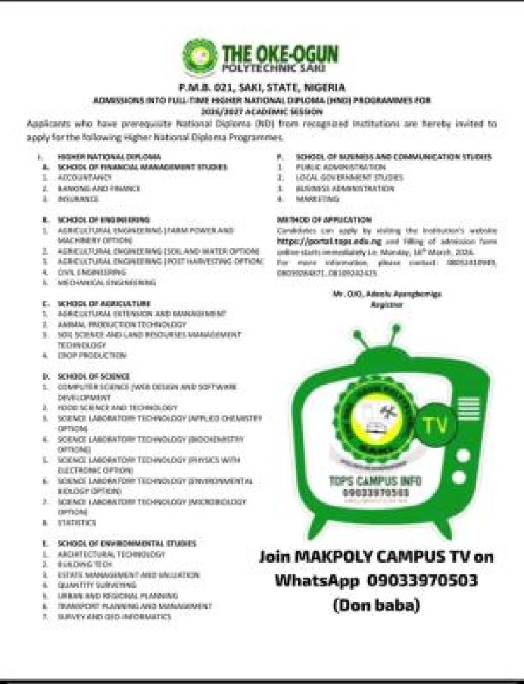 Interested candidates can apply online via the Polytechnic’s portal: https://portal.tops.edu.ng. Online application commences Monday, 16th March 2026.