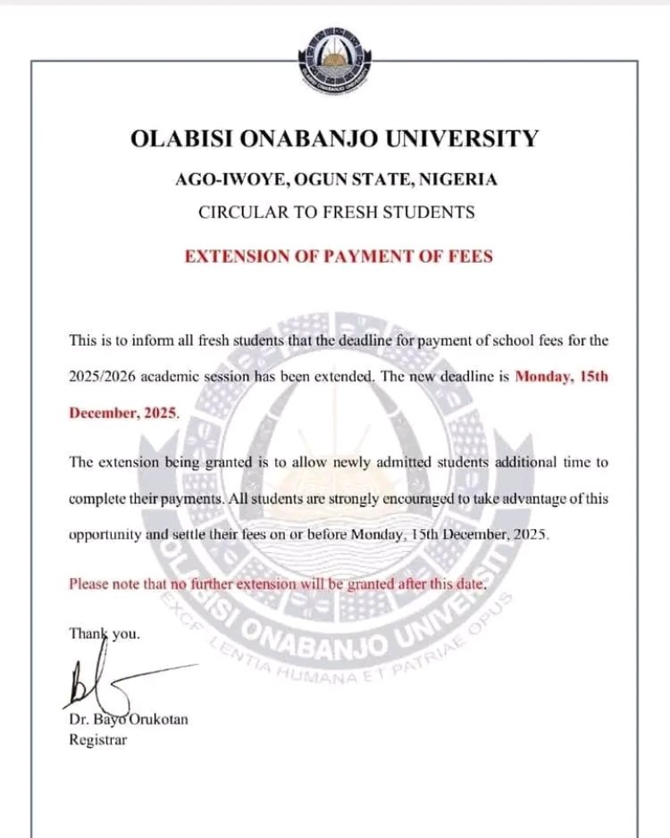 The Olabisi Onabanjo University (OOU) wishes to inform all fresh students that the deadline for payment of school fees for the 2025/2026 academic session has been extended.