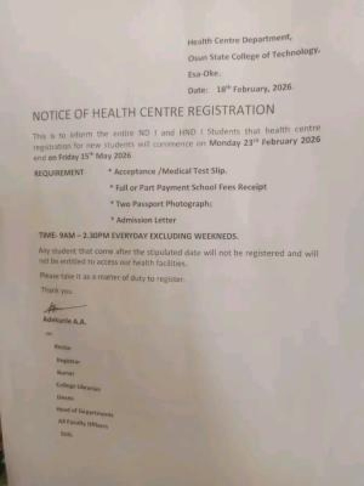 The Osun State College of Technology (OSCOTECH) has announced that health centre registration for new students will run from Monday, 23rd February 2026 to Friday, 15th May 2026.