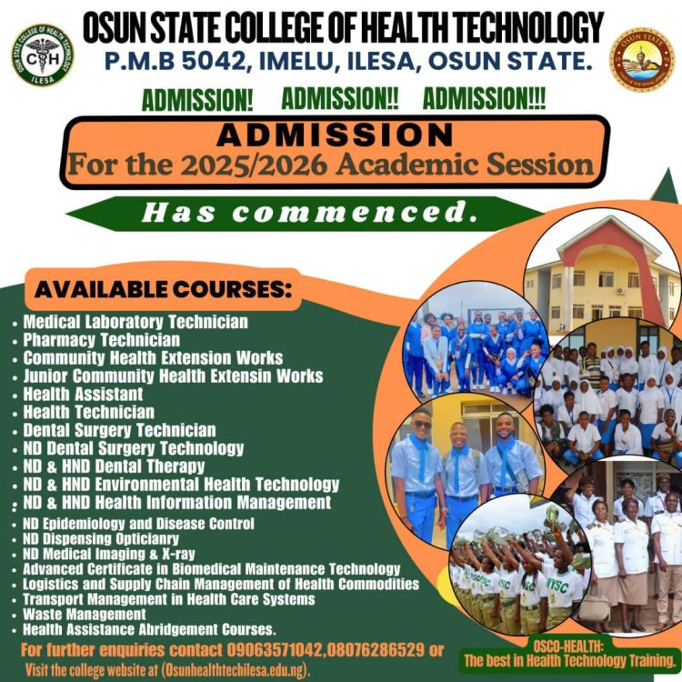The Osun State College of Health Technology, Imelu, Ilesa, has announced the commencement of its admission process for the 2025/2026 academic session. Prospective students are invited to apply for various health-related programs offered by the institution.