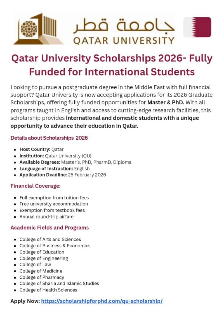 Qatar University is now accepting applications for its 2026 Graduate Scholarships, offering fully funded opportunities for international and domestic students seeking postgraduate degrees.