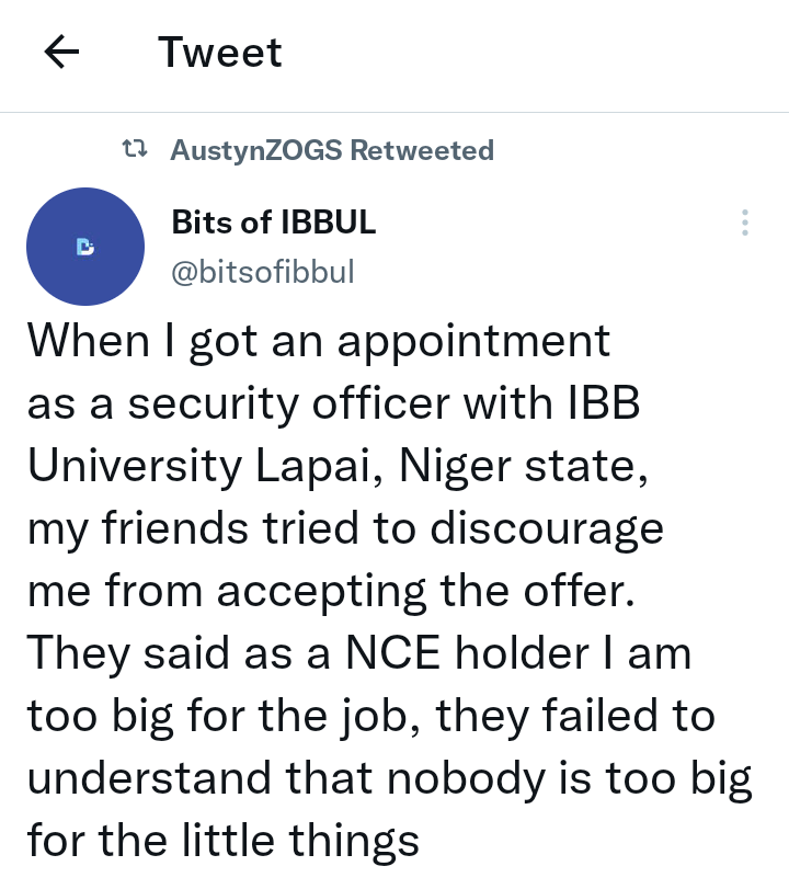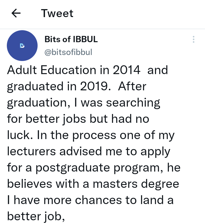 Narrating his journey on his Twitter handle @bitsofibbul, he said working in the university environment encouraged him to seek knowledge and so, in 2014, he applied for degree course in Adult Education and graduated with a Bachelor's degree in 2019.