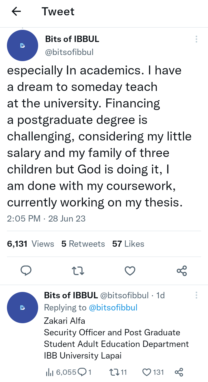 The man, whose name is Zakari Alfa, is working as a security officer at the Ibrahim Badamasi Babangida University, Lapai, Niger State, and is currently rounding off his Master's Degree programme in the Department of Adult Education in the university.