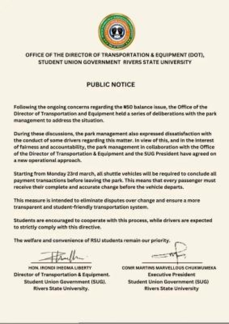 The Students’ Union Government at Rivers State University has introduced a new operational directive targeting persistent complaints over disputed ₦50 change balances in campus transportation.