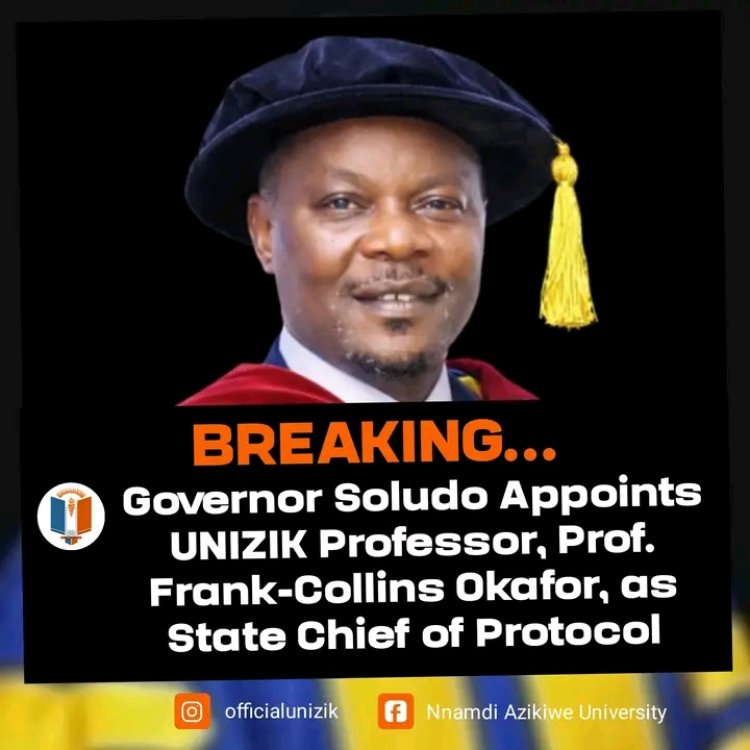 The Governor of Anambra State, Prof. Charles Chukwuma Soludo, has appointed Prof. Frank-Collins Nnamdi Okafor as the new State Chief of Protocol (SCOP), in a development viewed as a strong endorsement of the academic and leadership strength of Nnamdi Azikiwe University, Awka.