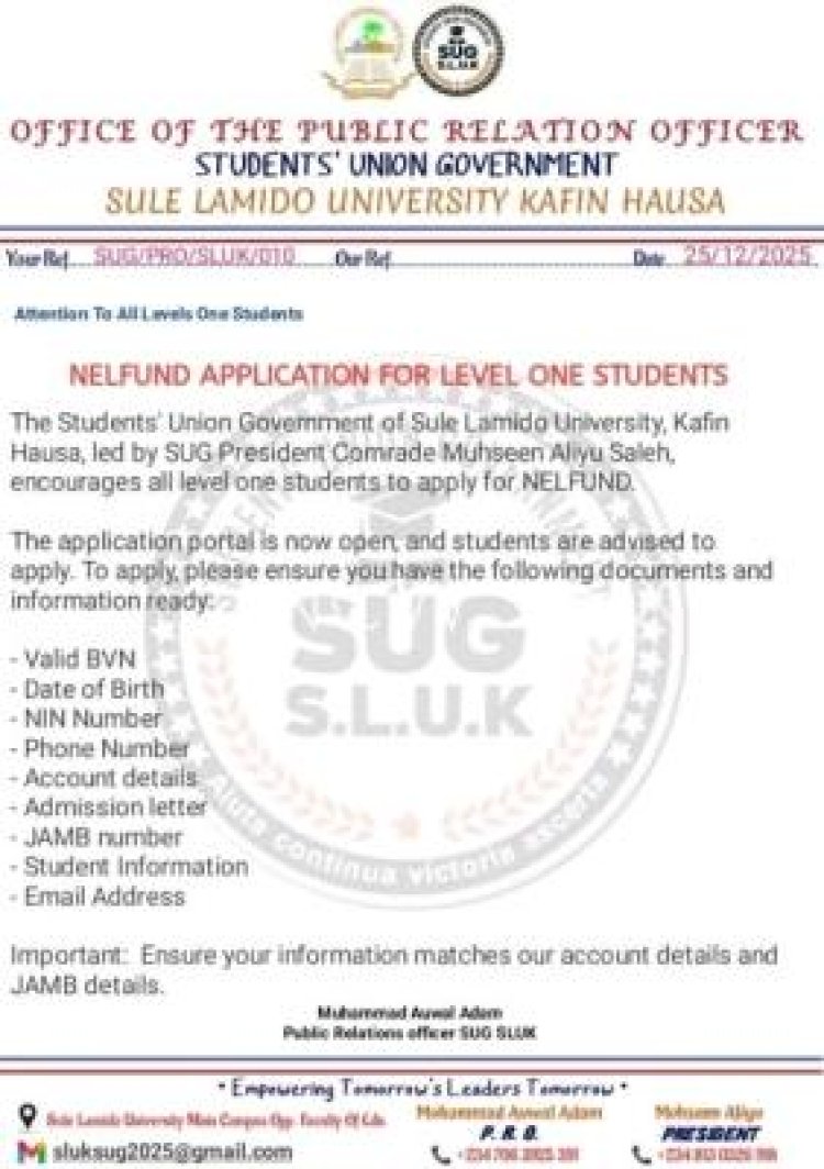 The Students' Union Government (SUG) of Sule Lamido University (SLUK), led by SUG President Comrade Muhseen Aliyu Saleh, has announced the opening of the National Education Loan Fund (NELFUND) application portal for all level one students.