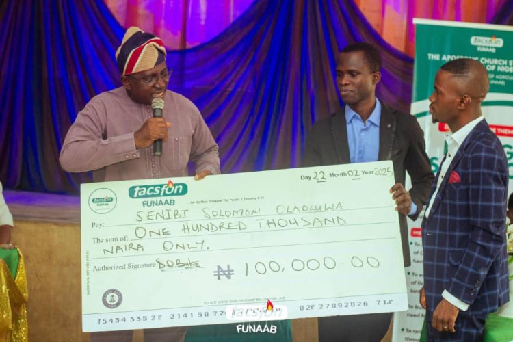 The Apostolic Church Students' Fellowship of Nigeria (TACSFON) has honoured outstanding graduates of the Federal University of Agriculture, Abeokuta (FUNAAB) at a grand Award Ceremony held at the Anthony Anenih Lecture Theatre. The event celebrated the Best Graduating Student and First-Class Graduates of the 2023/2024 Academic Session, drawing the attention of dignitaries, students, and well-wishers from within and beyond the university community.