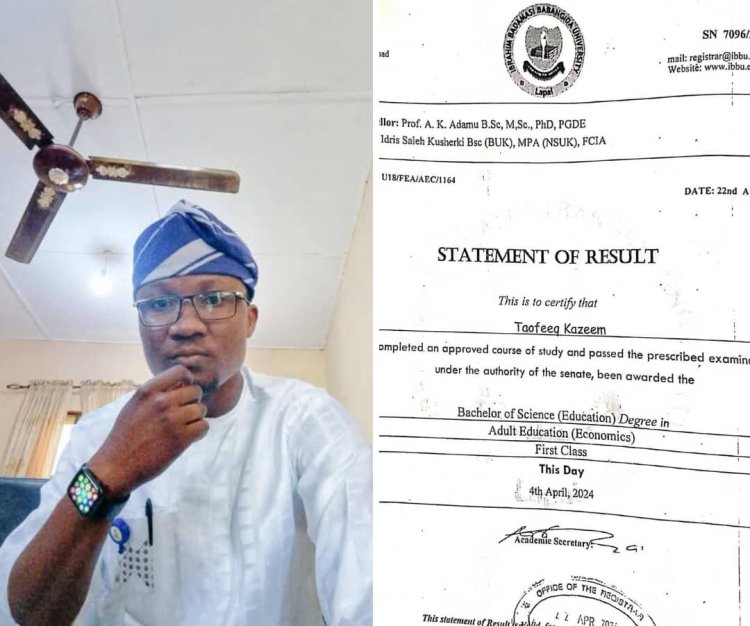 Taofeeq Kazeem, a remarkable student, has graduated with First Class Honours from Ibrahim Badamasi Babangida University, Lapai, Niger State. He achieved a outstanding CGPA of 4.70/5.00 in Adult Education/Economics, demonstrating his dedication to academic excellence.