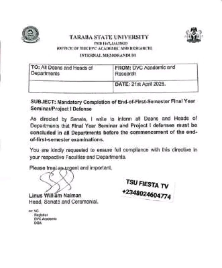 Taraba State University (TASU) has issued a directive mandating the completion of all final year seminar and Project I defenses before the commencement of first semester examinations.