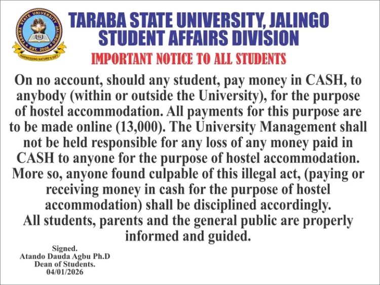 The Taraba State University (TASU), Jalingo, has issued a stern warning to students, parents, and the general public against making or accepting cash payments for hostel accommodation, declaring the practice illegal and punishable.