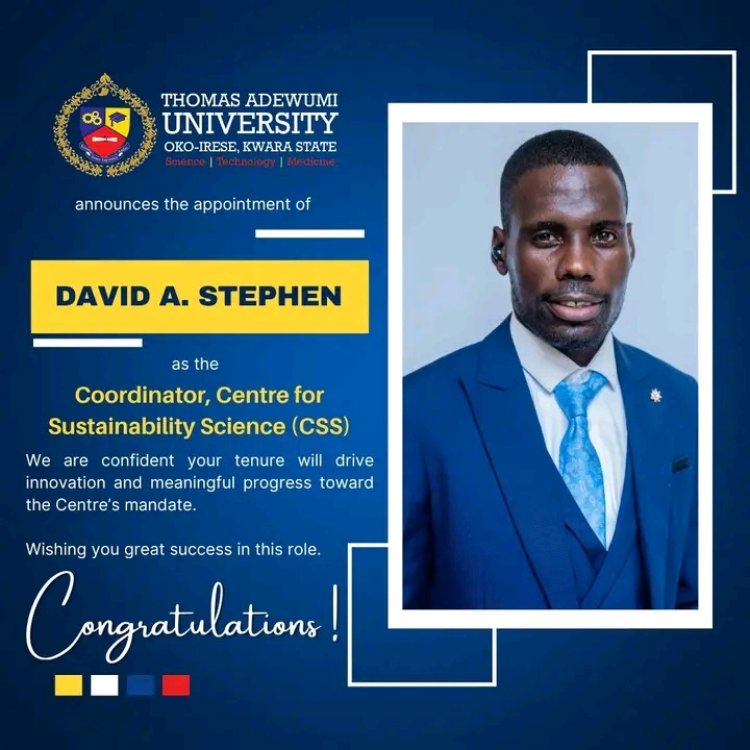 Thomas Adewumi University has approved the appointment of Mr. David A. Stephen of the Department of Public Health as Coordinator of its Centre for Sustainability Science.