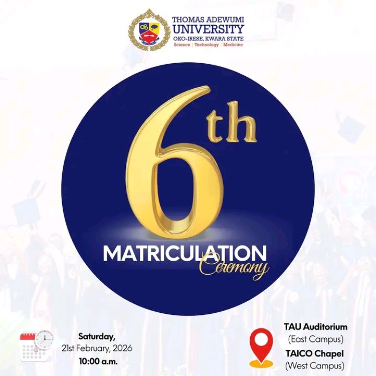 The Thomas Adewumi University (TAU) will on Saturday, February 21, 2026, hold its 6th Matriculation Ceremony to formally admit a new set of students into the institution’s academic community.