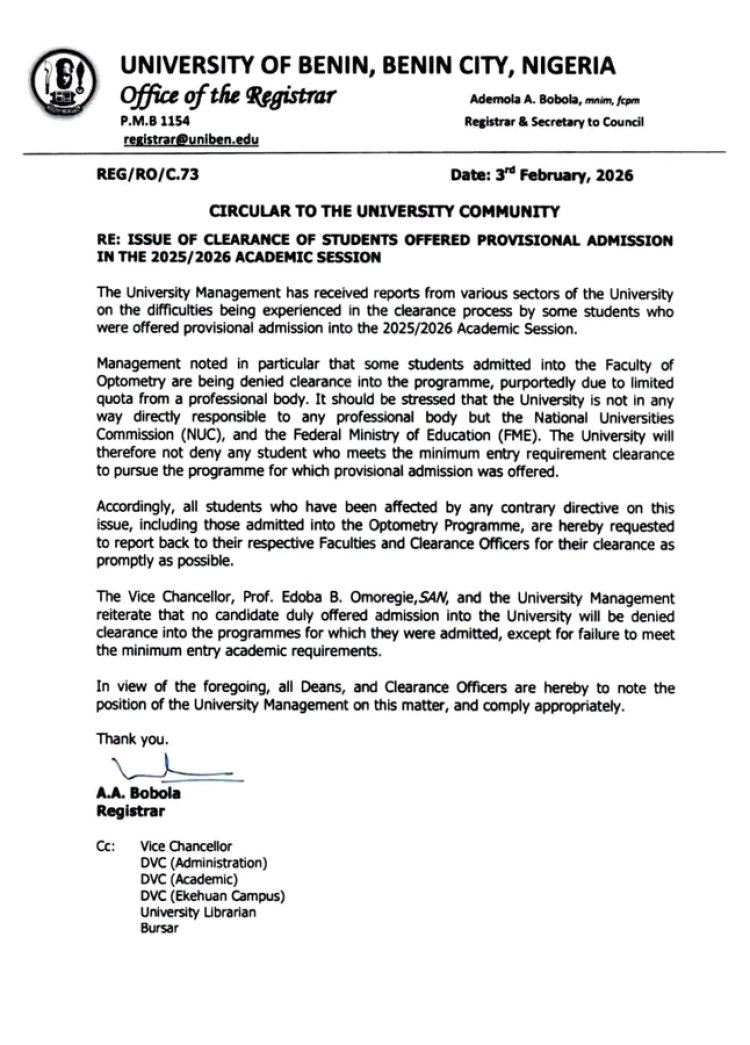 The University of Benin (UNIBEN) Management has addressed concerns regarding difficulties some students face in the clearance process for the 2025/2026 Academic Session, particularly those admitted provisionally.