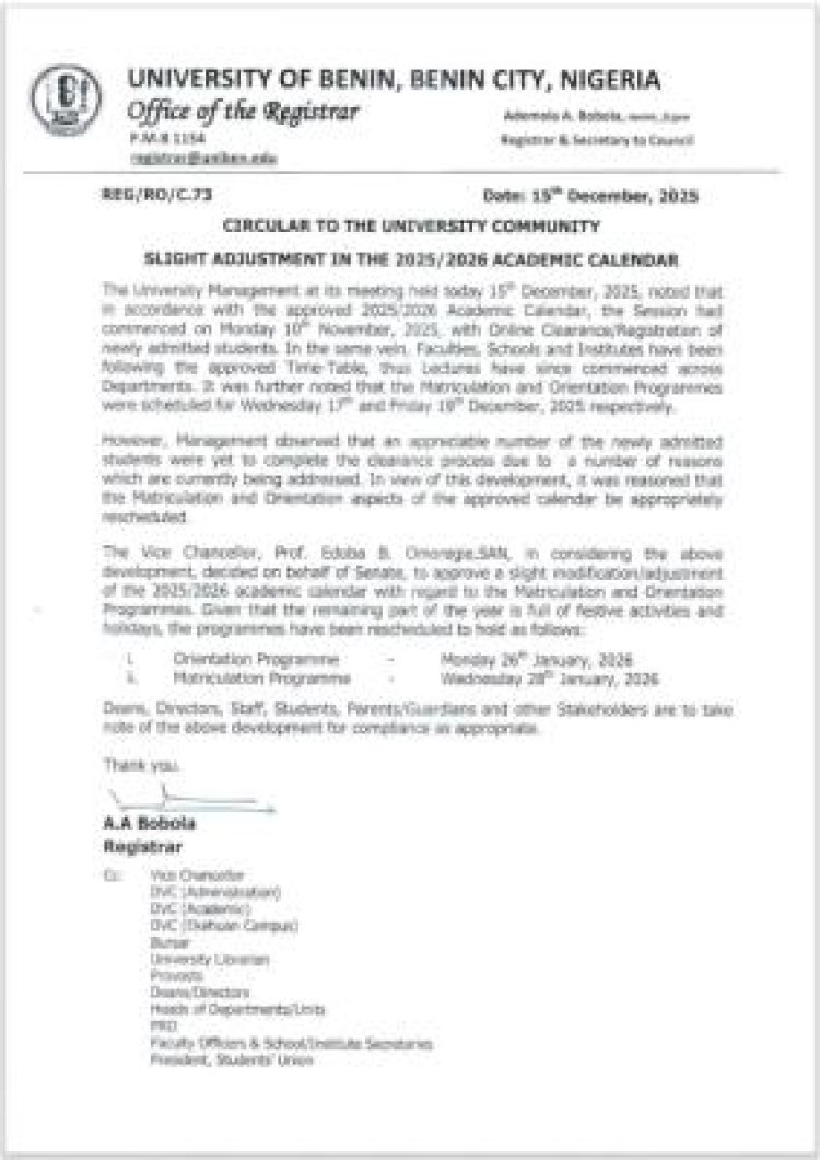 The University of Benin (UNIBEN) has announced a revision to its 2025/2026 Academic Calendar, specifically affecting the Orientation and Matriculation ceremonies for newly admitted students.
