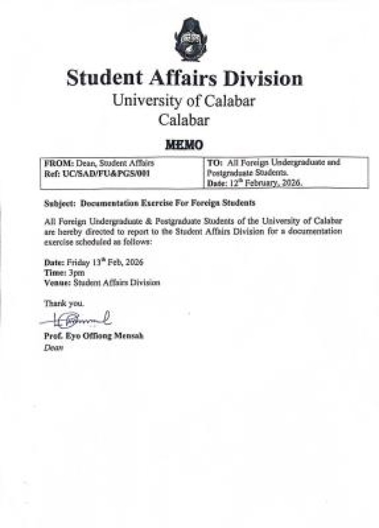 According to a memo issued by the Dean of Student Affairs, Professor Eyo Offiong Mensah, the exercise is scheduled for Friday, 13th February 2026, at 3:00 p.m., and will take place at the Student Affairs Division, University of Calabar.