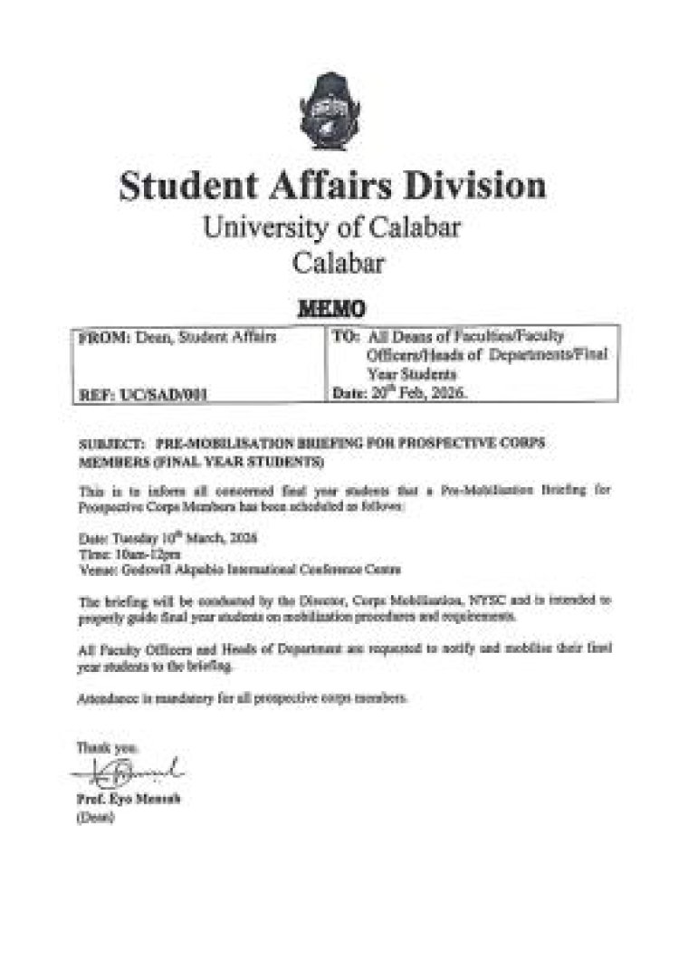 According to a memo issued by the Dean of Student Affairs, Prof. Eyo Mensah, the briefing will hold on Tuesday, 10th March 2026, from 10:00 AM to 12:00 PM at the Godswill Akpabio International Conference Centre, Calabar.