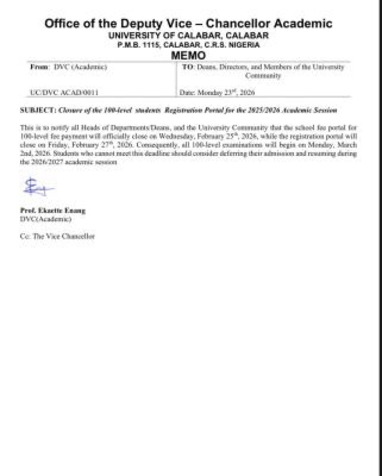 The Office of the Deputy Vice-Chancellor (Academic) at the University of Calabar (UNICAL) has announced the official closure dates for 100-level students’ registration and fee payment for the 2025/2026 academic session.