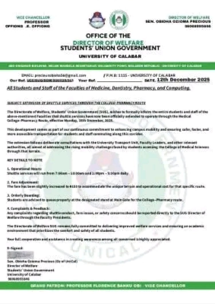 The Students’ Union Government (SUG) Directorate of Welfare at the University of Calabar (UNICAL) has announced the extension of the university’s shuttle service to the College of Medical Sciences and Pharmacy axis, in a move aimed at improving mobility and easing transportation challenges faced by students and staff.
