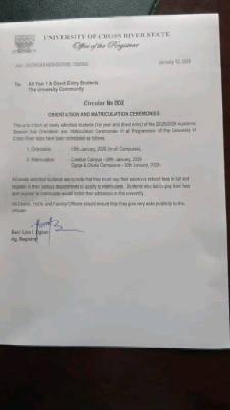 All newly admitted students (1st year and direct entry) of the 2025/2026 academic session at the University of Cross River State (UNICROSS) are hereby informed of the schedule for Orientation and Matriculation Ceremonies: