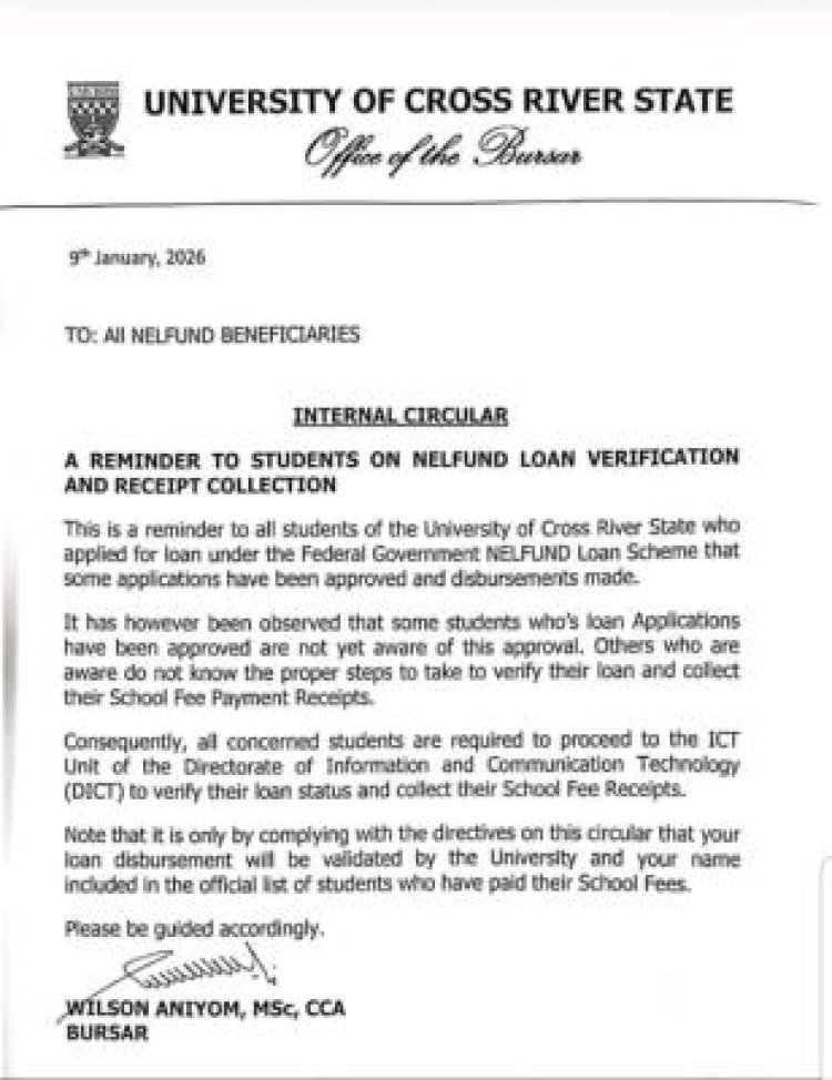 The University of Cross River State (UNICROSS) has issued a directive to students who benefited from the Federal Government NELFUND Loan Scheme to immediately complete their loan verification and collect their official school fee payment receipts.