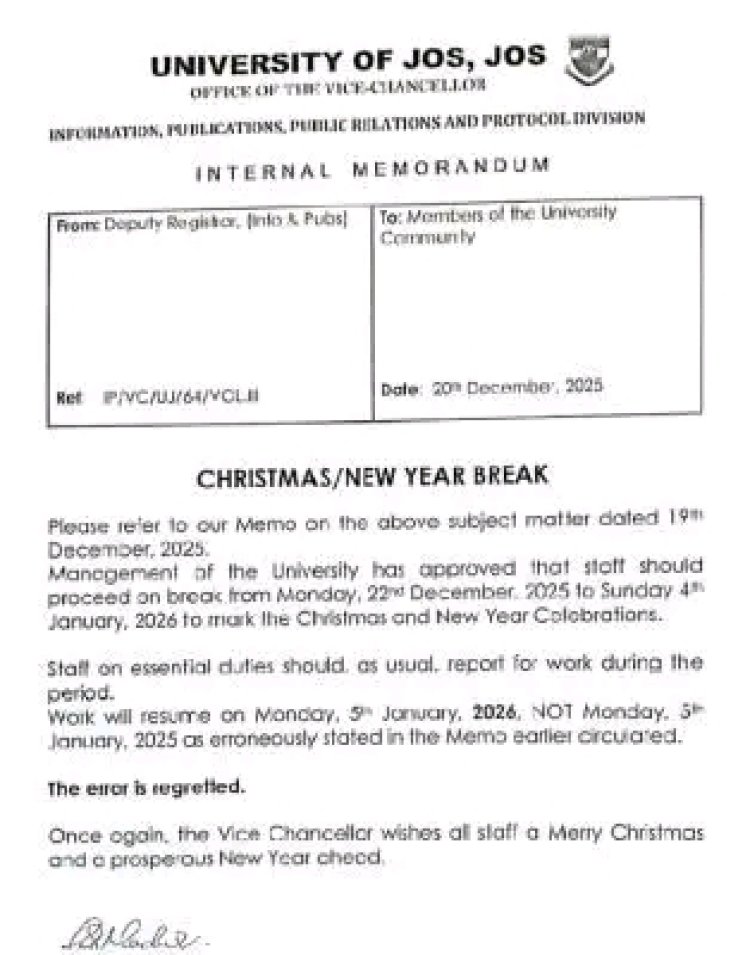 The Management of the University of Jos (UNIJOS) has announced the timetable for the 2025 Christmas and New Year break and clarified the official resumption date for academic and administrative activities.