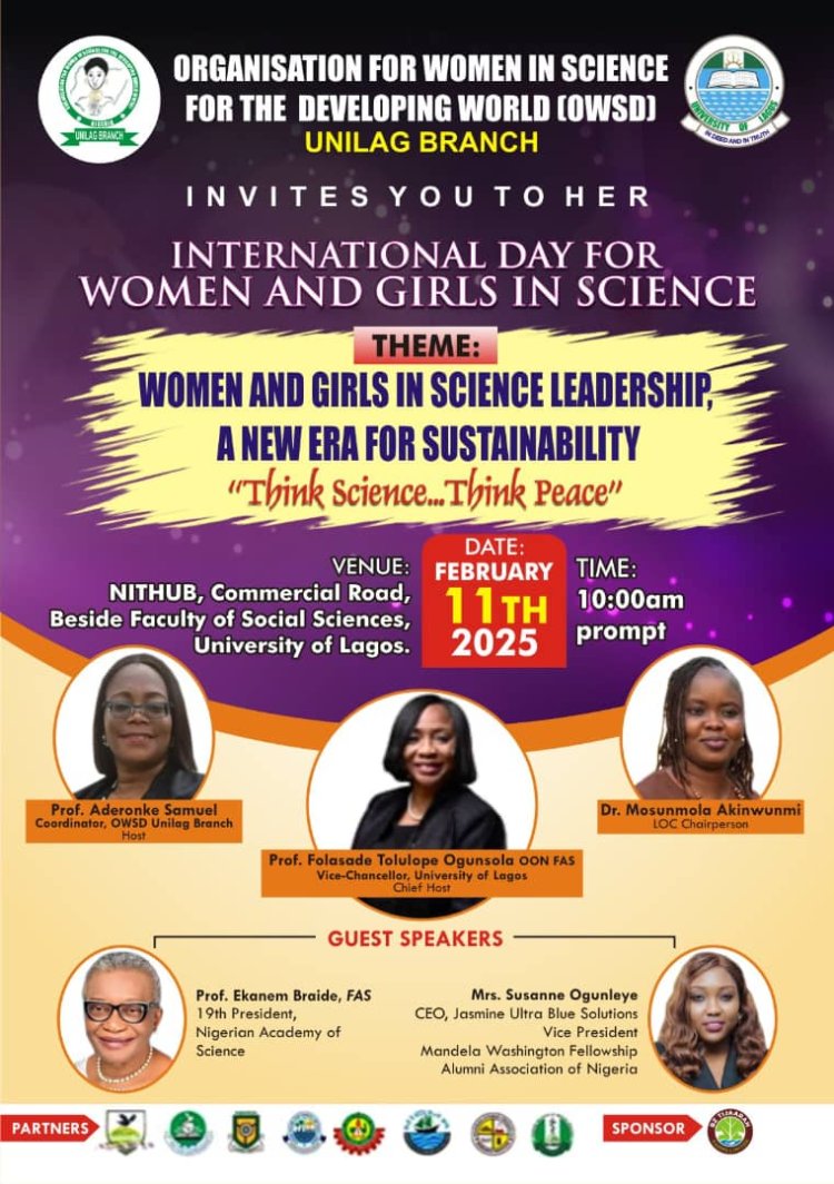 The Organisation for Women in Science for the Developing World (OWSD), University of Lagos (UNILAG) Branch, is set to commemorate the International Day for Women and Girls in Science on Tuesday, February 11, 2025. The event will take place at NitHub, No. 6, Commercial Road, UNILAG, Akoka, starting at 10:00 a.m.