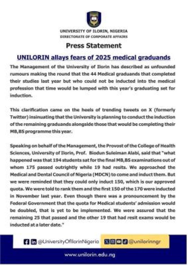 The management of the University of Ilorin (UNILORIN) has debunked reports alleging that 44 medical graduands would be forced to wait until 2026 for their professional induction, describing the claims as misleading and unfounded.