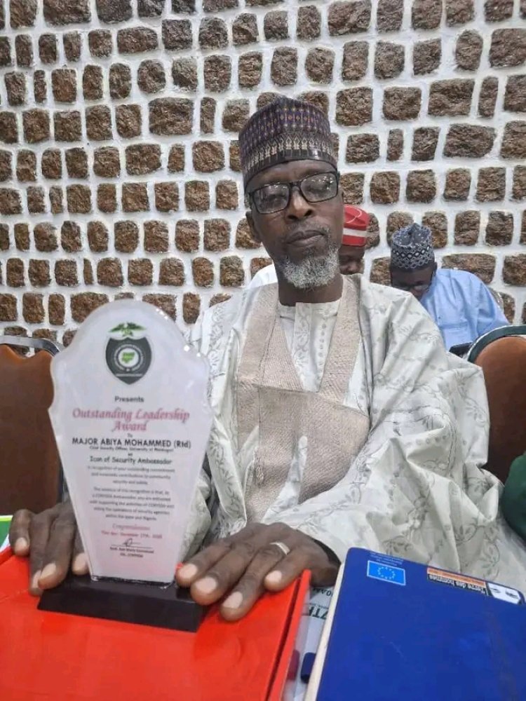 The Chief Security Officer of the University of Maiduguri (UNIMAID), Major Mohammed Abiya (Rtd.), has been honoured with the Icon of Security Ambassadorship Award by the Coalition of Nigerian Youth on Security and Safety Affairs (CONYSSA) in recognition of his outstanding contributions to security management and community safety.