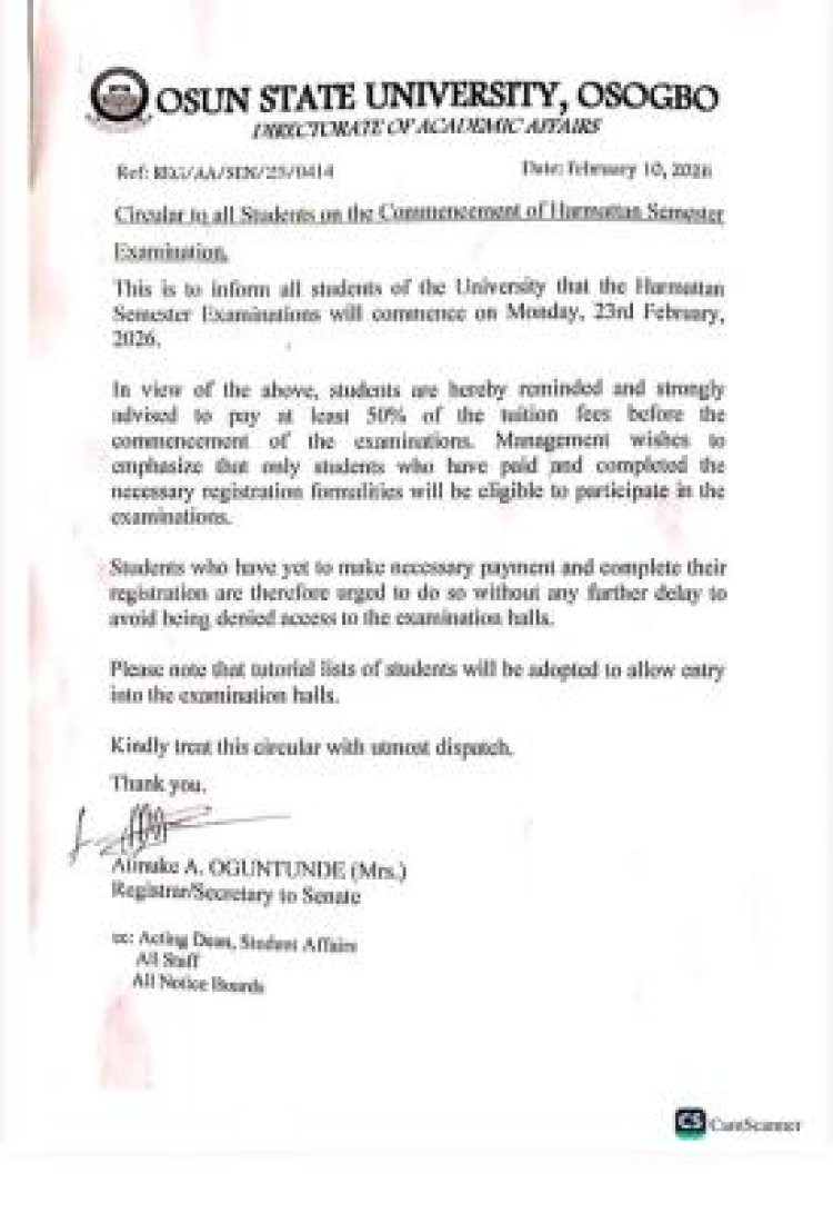 The management of Osun State University (UNIOSUN) has officially announced that the Harmattan Semester Examinations for the 2025/2026 academic session will commence on Monday, 23rd February 2026.
