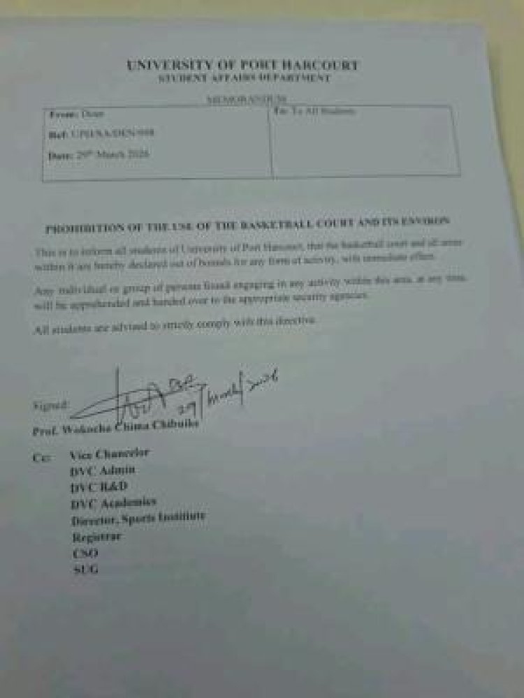 The University of Port Harcourt has issued a directive prohibiting students from using the university’s basketball court and its surrounding areas with immediate effect.
