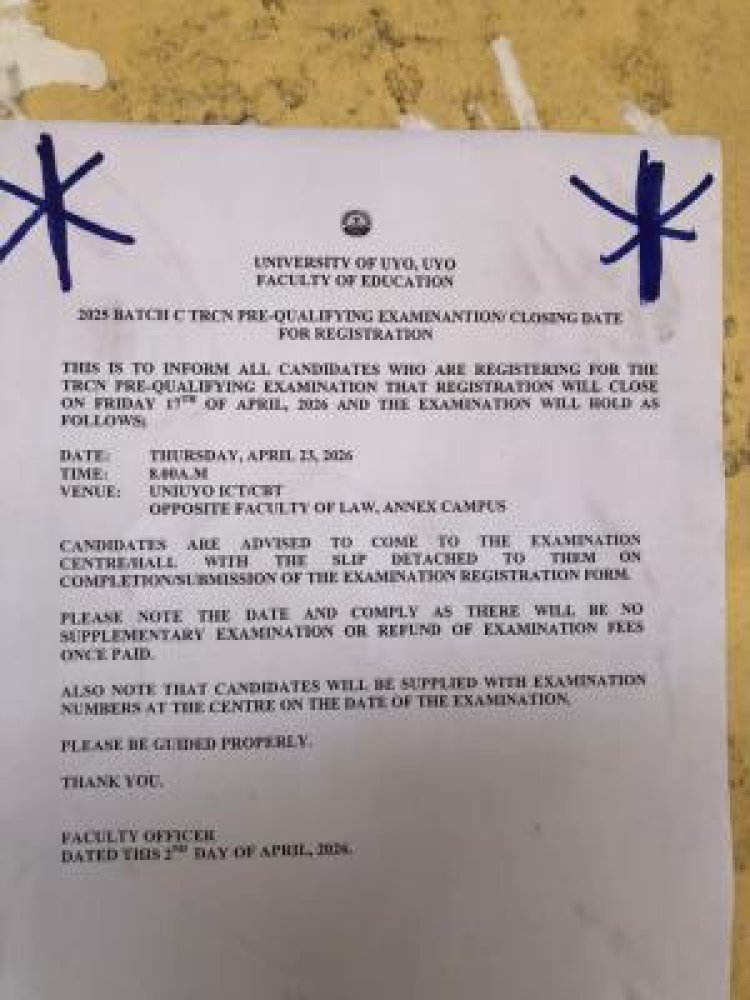 The Faculty of Education, University of Uyo has announced that registration for the 2025 Batch C Teachers Registration Council of Nigeria (TRCN) Pre-Qualifying Examination will close on Friday, April 17, 2026.