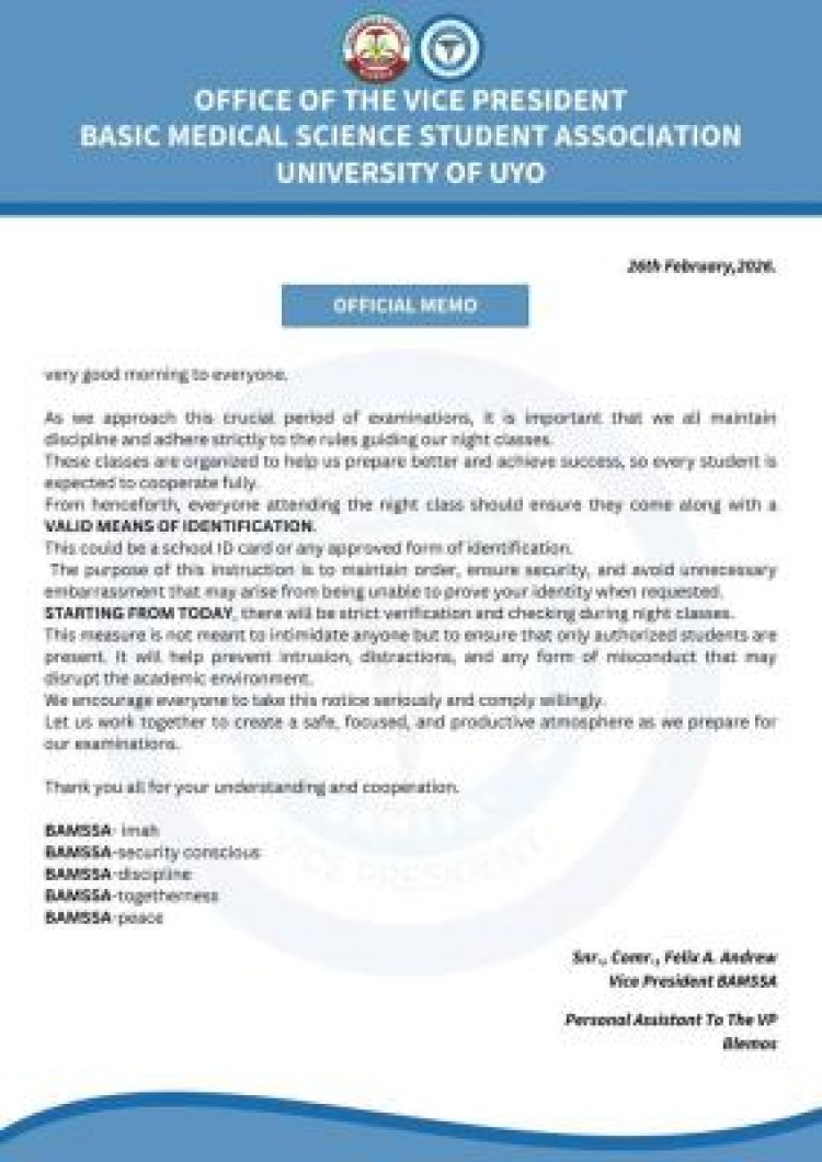 The Basic Medical Science Student Association (BAMSSA) of the University of Uyo has introduced stricter security measures for students attending night classes during the ongoing examination period.