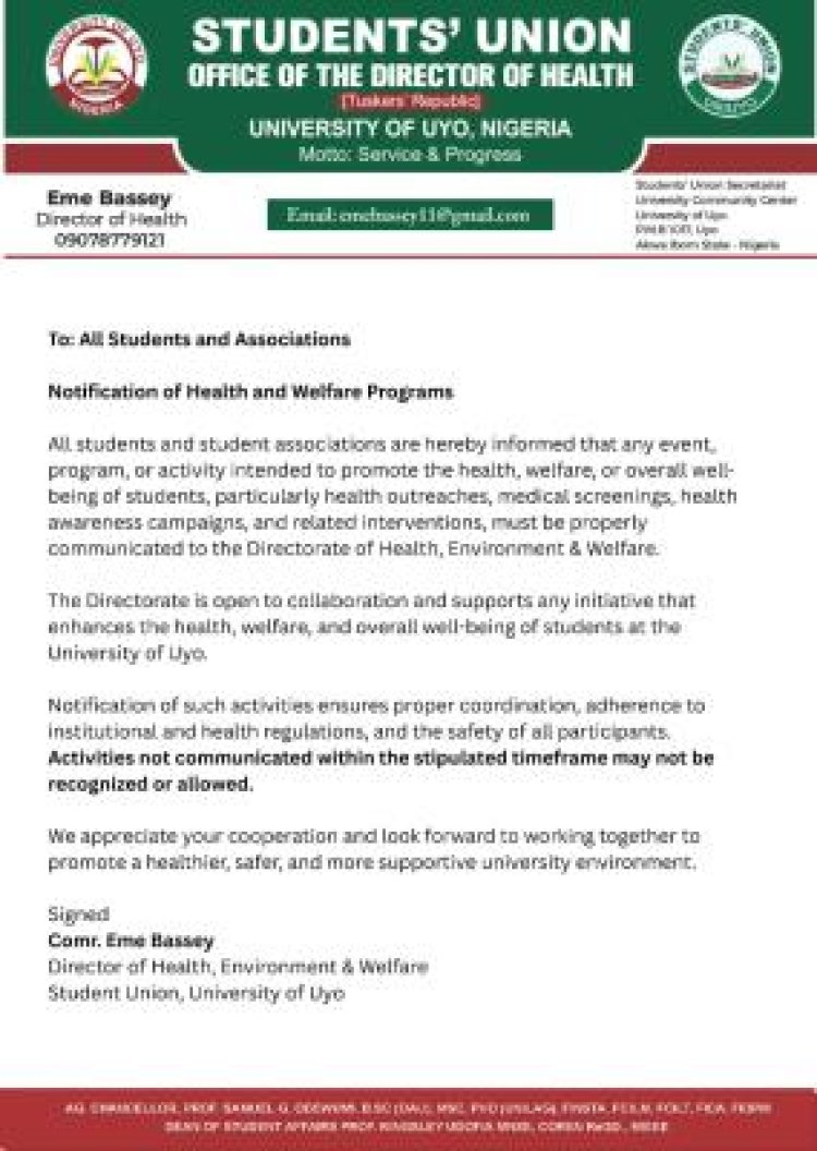 The Student Union Government of the University of Uyo (UNIUYO) has issued a directive requiring all students and student associations to notify and obtain approval from the Directorate of Health, Environment & Welfare before organizing any health-related events on campus.