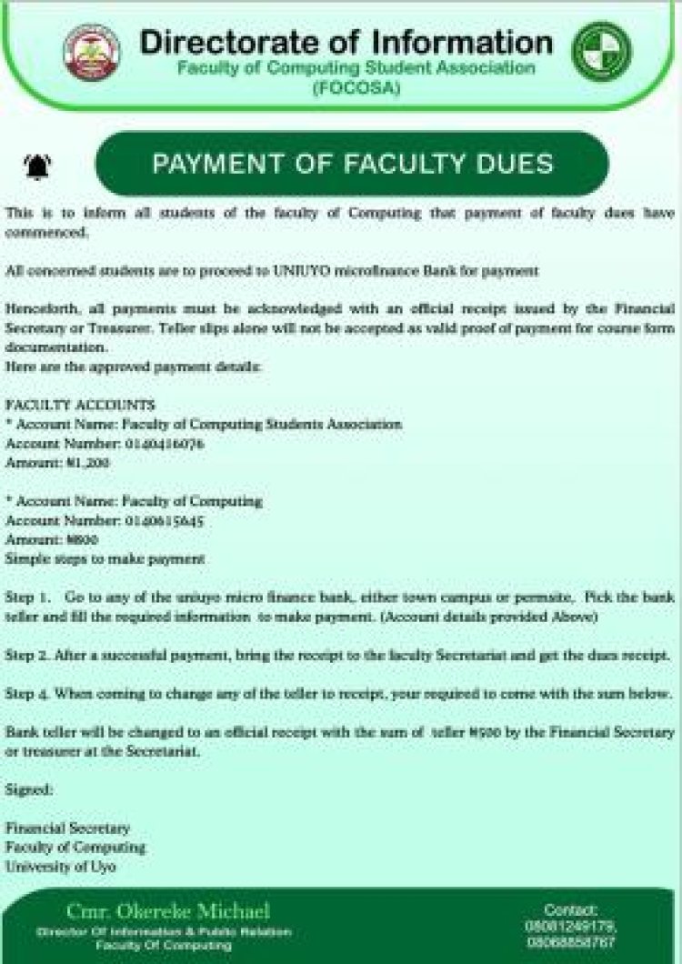 The Faculty of Computing Students Association (FOCOSA), University of Uyo, has announced the commencement of payment of faculty dues for all students of the Faculty of Computing.