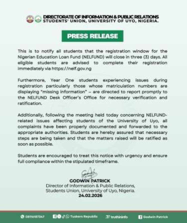 The Students' Union Government of the University of Uyo (UNIUYO) has issued a reminder to all eligible students that the registration window for the Nigerian Education Loan Fund (NELFUND) will close in just three days.