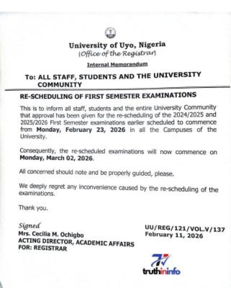 The University of Uyo (UNIUYO) has announced a rescheduling of its First Semester Examinations for both the 2024/2025 and 2025/2026 academic sessions.