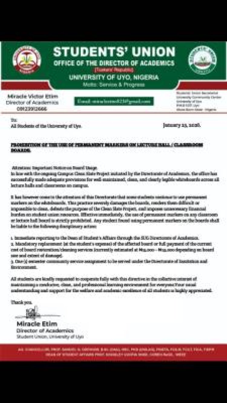 The Students’ Union Government (SUG) of the University of Uyo has announced a strict prohibition on the use of permanent markers in all lecture halls and classrooms across campus.