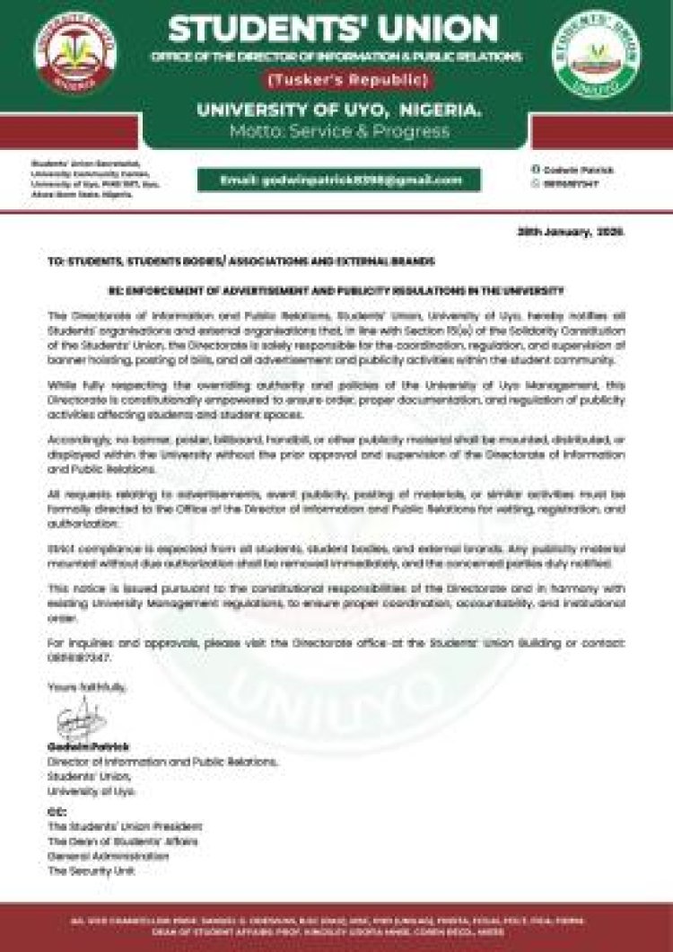 The Directorate of Information and Public Relations of the Students’ Union, University of Uyo (UNIUYO) has announced strict enforcement of advertisement and publicity rules across the University community.