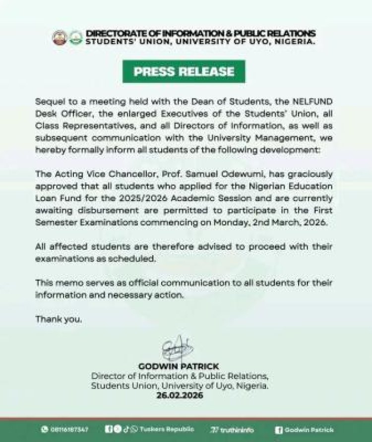 The Students’ Union Government (SUG) of the University of Uyo (UNIUYO) has confirmed that students awaiting the Nigerian Education Loan Fund (NELFUND) for the 2025/2026 academic session are eligible to write their first semester examinations.