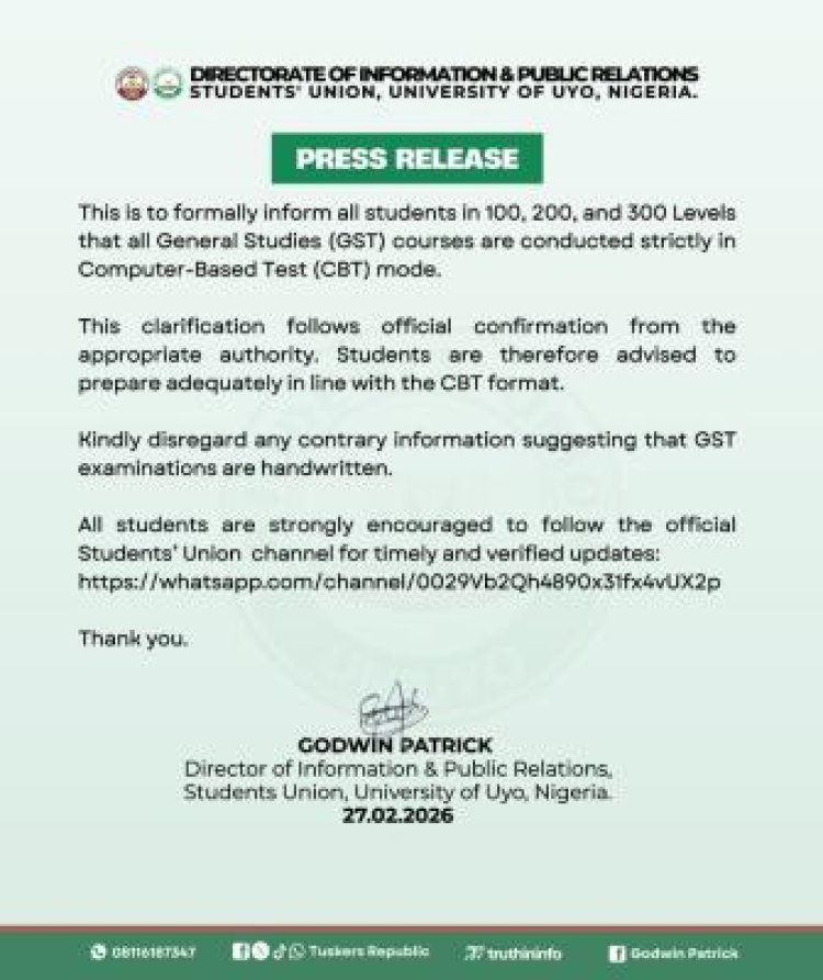 The Directorate of Information & Public Relations of the Students' Union, University of Uyo (UNIUYO) has clarified that all General Studies (GST) examinations for 100, 200, and 300-level students will be conducted strictly in Computer-Based Test (CBT) format.